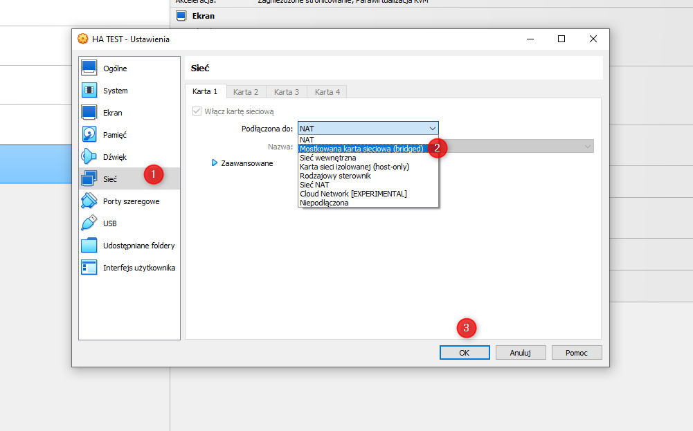 W kolejnym oknie wybieramy Sieć=>Mostkowana karta sieciowa=>OK