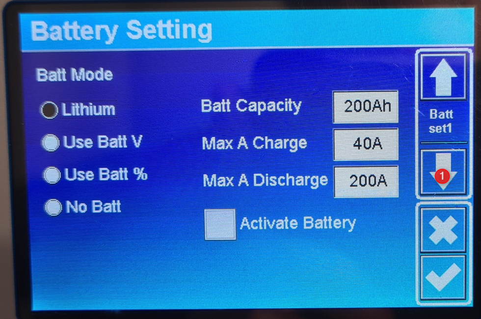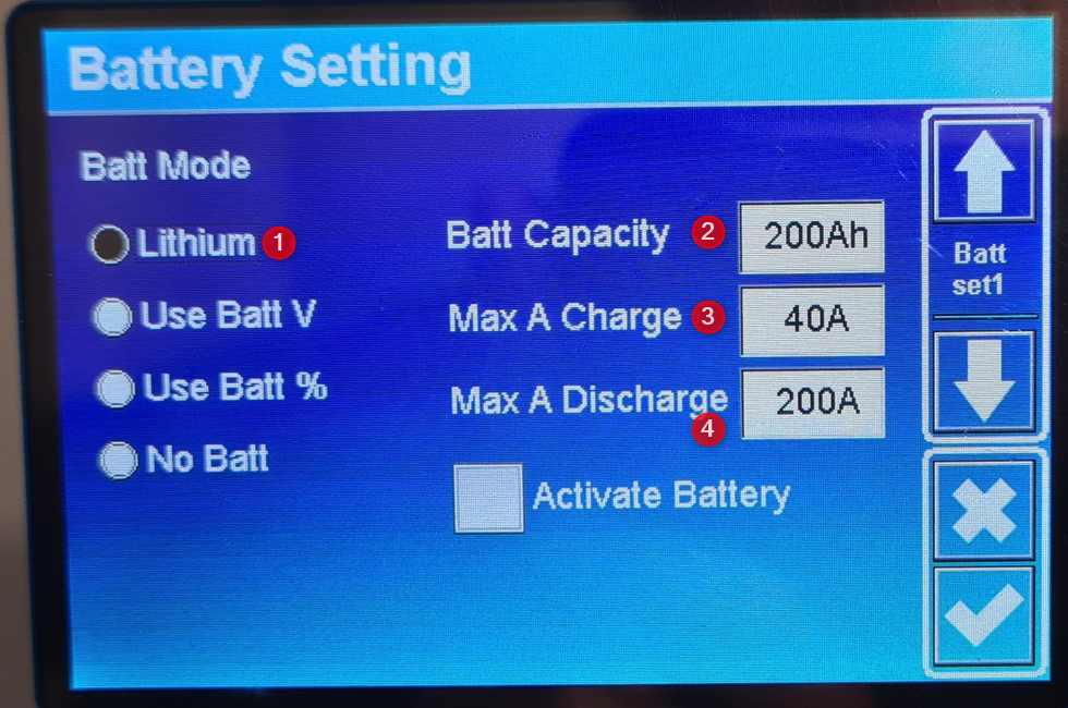 Zaznaczamy Lithium (1), pojemność naszej baterii (2), maksymalną moc ładowania (3) i maksymalną moc rozładowania (4). Ciekawą opcją jest Activate Battery – funkcja ta służy do pobudzenia głęboko rozładowanej baterii i w normalnym trybie nie powinna być aktywowana. Dane na temat trzech ostatnich wartości powinniśmy odczytać z karty katalogowej naszego banku energii.