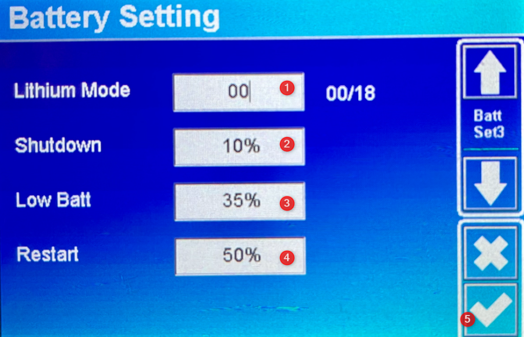 Ostatni parametr Restart (4) jest to % naładowania baterii w którym falownik wznowi pracę, tutaj proponuje ustawić 40%. Jeżeli mamy wszystko ustawione całość zatwierdzamy przyciskiem (5).